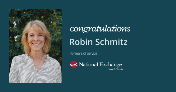 Robin Schmitz recently celebrated 45 years of service to National Exchange Bank & Trust.